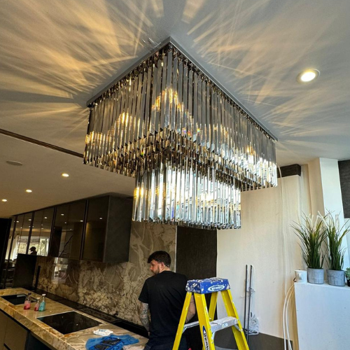 The mix of crystal rods and polished chrome made it look classy and high-end. Its warm lighting completely changed the vibe of the space, making it feel both cosy and elegant.